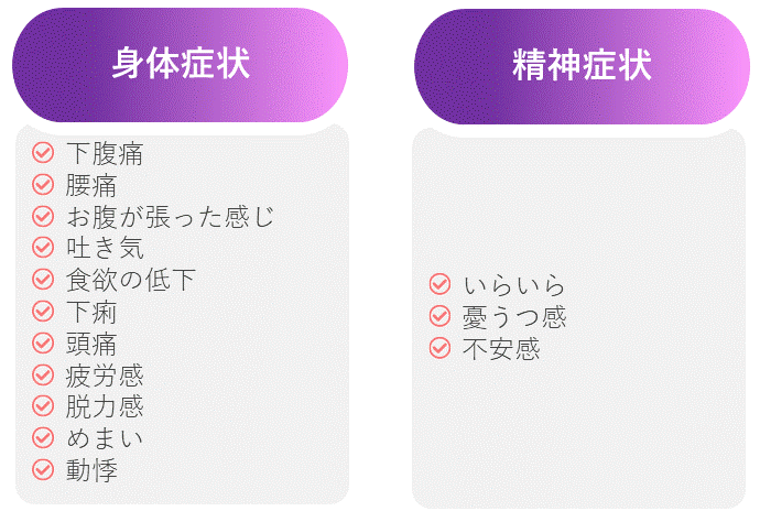 月経(生理)の期間に起こるお腹や腰の痛みなど不快な症状を月経痛(生理痛)といいます。これは月経血を子宮から体外に排出する過程で痛みが起こります。 症状は下腹痛や腰痛以外にも、お腹が張った感じや吐き気、食欲の低下、下痢、頭痛のほか、疲労感や脱力感、めまい、動悸、いらいらや憂うつ感、不安感など精神症状を伴うことも多くあります。